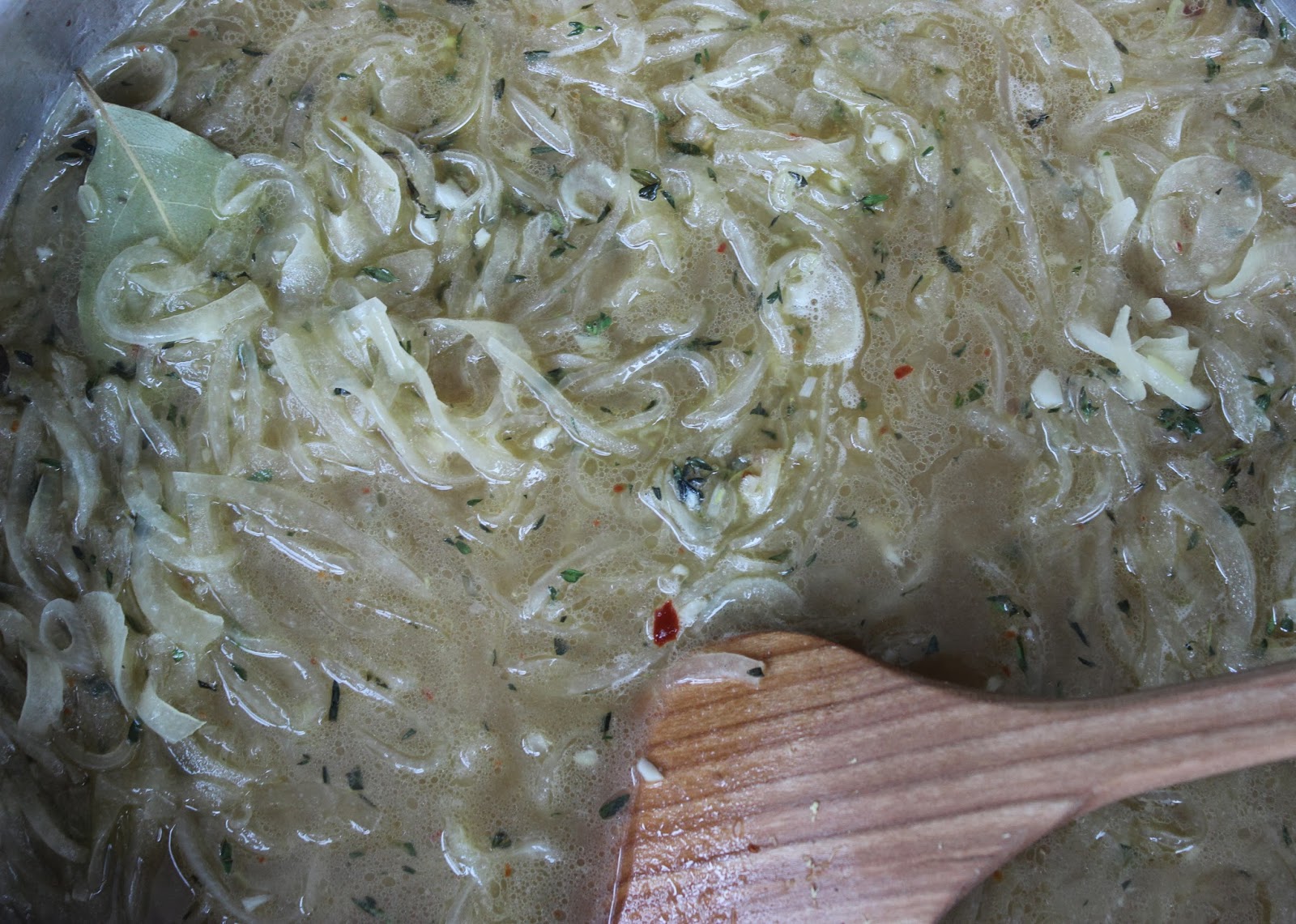 Add one cup of dry white wine (something you enjoy drinking – make sure to pour yourself a glass while you cook) to the pan along with one and one half cups unsalted chicken broth, one bay leaf and one half tsp of kosher salt.