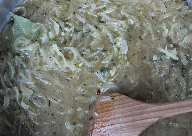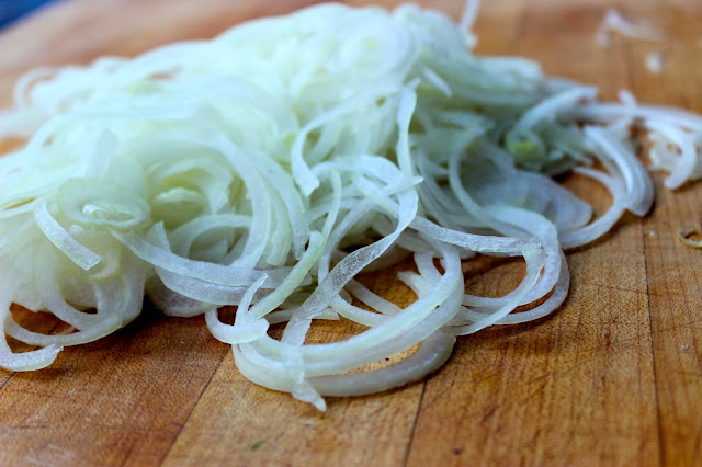 - one half of a large onion, sliced very thinly (mandolin recommended)