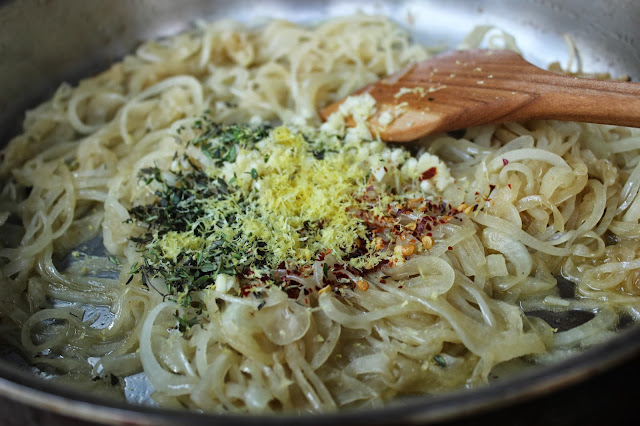 Allow the onions to cook down for five minutes until they begin to sweat and are translucent. Add two tsp of minced fresh thyme, one tbs of minced garlic, one eighth of a tsp red pepper flakes and the zest from one lemon. Toss to combine and warm through for one minute.