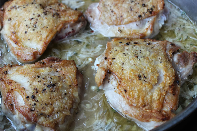 Select chicken thighs with the bone and skin still intact. The bone will simply add a greater depth of flavor and we are going to give the skin a solid sear, leaving it crispy and crunchy. Add a liberal amount of kosher salt and freshly ground black pepper to both sides of the chicken. Heat a large skillet with tall sides over medium high heat. Add one tbs olive oil and one tbs unsalted butter and then place the chicken thighs in the pan, skin-side down. Sear for seven minutes and remove to plate and set aside. Bring the heat on the pan down to medium-low.