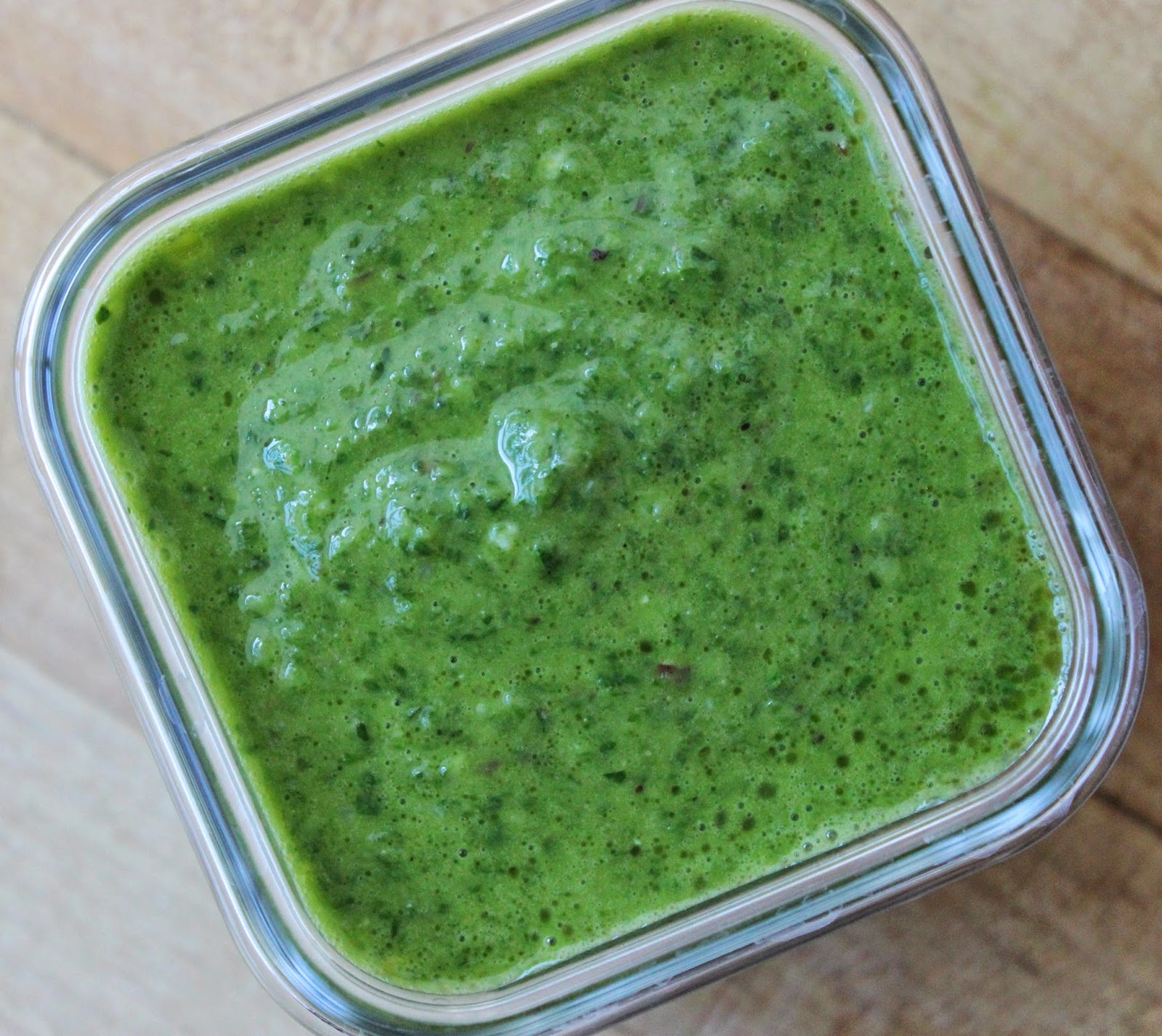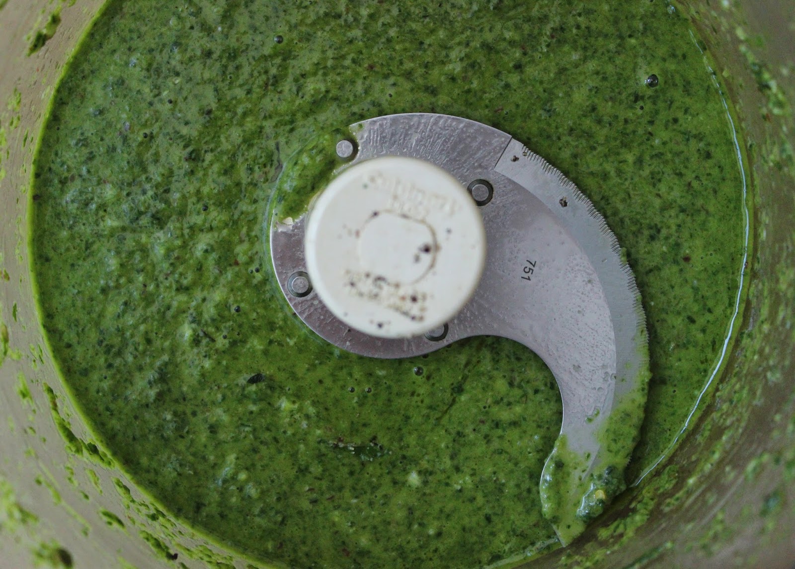 Blend to combine and chop. While the blade is running, add six tbs of olive oil into the feed tube, creating a smooth sauce. Remove to a bowl and set aside (this can be made ahead of time and will last in the refrigerator for up to one week).