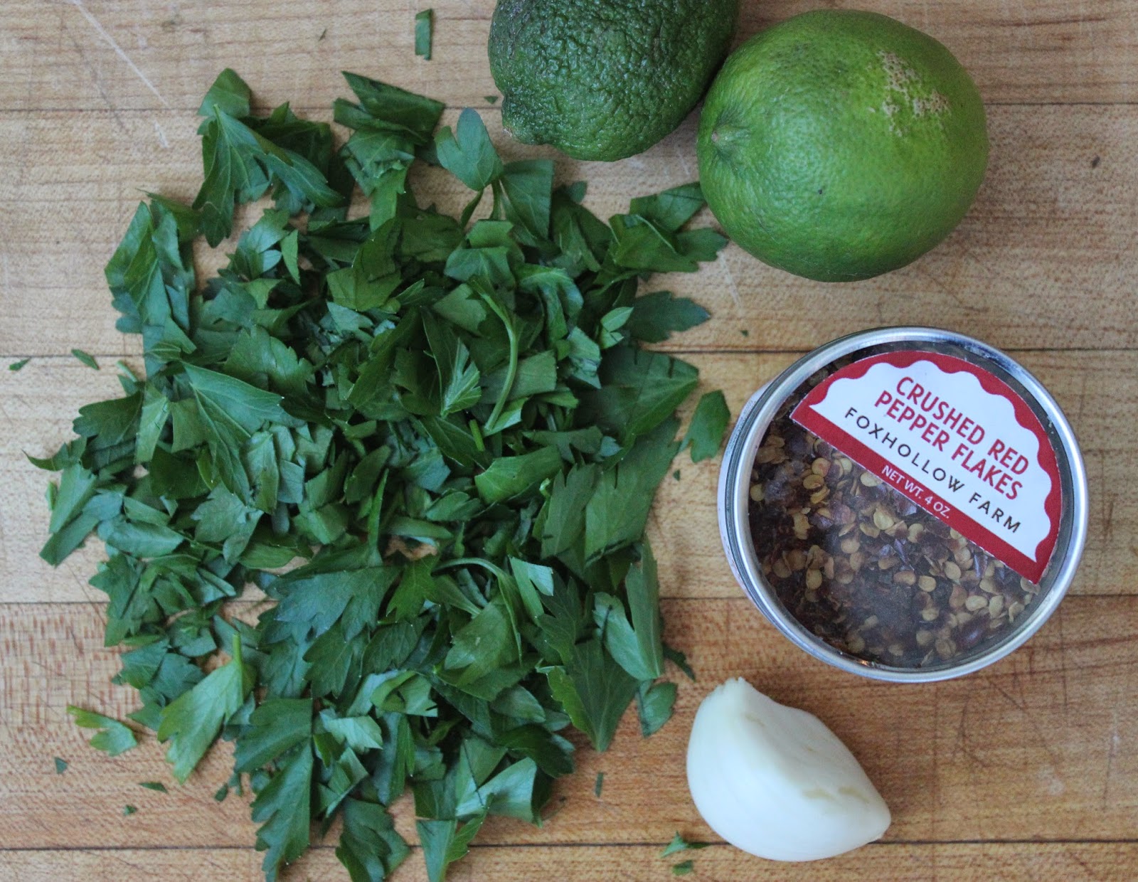Add one garlic clove, one quarter tsp Foxhollow Farm red pepper flakes, the juice of one large lime or two small limes, two tbs fresh parsley, one quarter cup red wine vinegar, one half tsp kosher salt and one quarter tsp freshly ground black pepper.