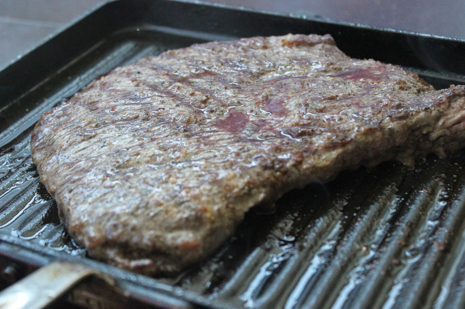 Set a grill pan over medium high heat and allow to warm. Pat the steak to be sure it is dry (this allows for a nice sear) and season liberally with kosher salt and freshly ground black pepper. Drizzle olive oil over one side of the steak and place it on the hot grill, oiled side down. Grill for three and a half minutes on each side for medium to medium rare. Drizzle additional olive oil to the top of the steak and then flip, cooking for another three and a half minutes.