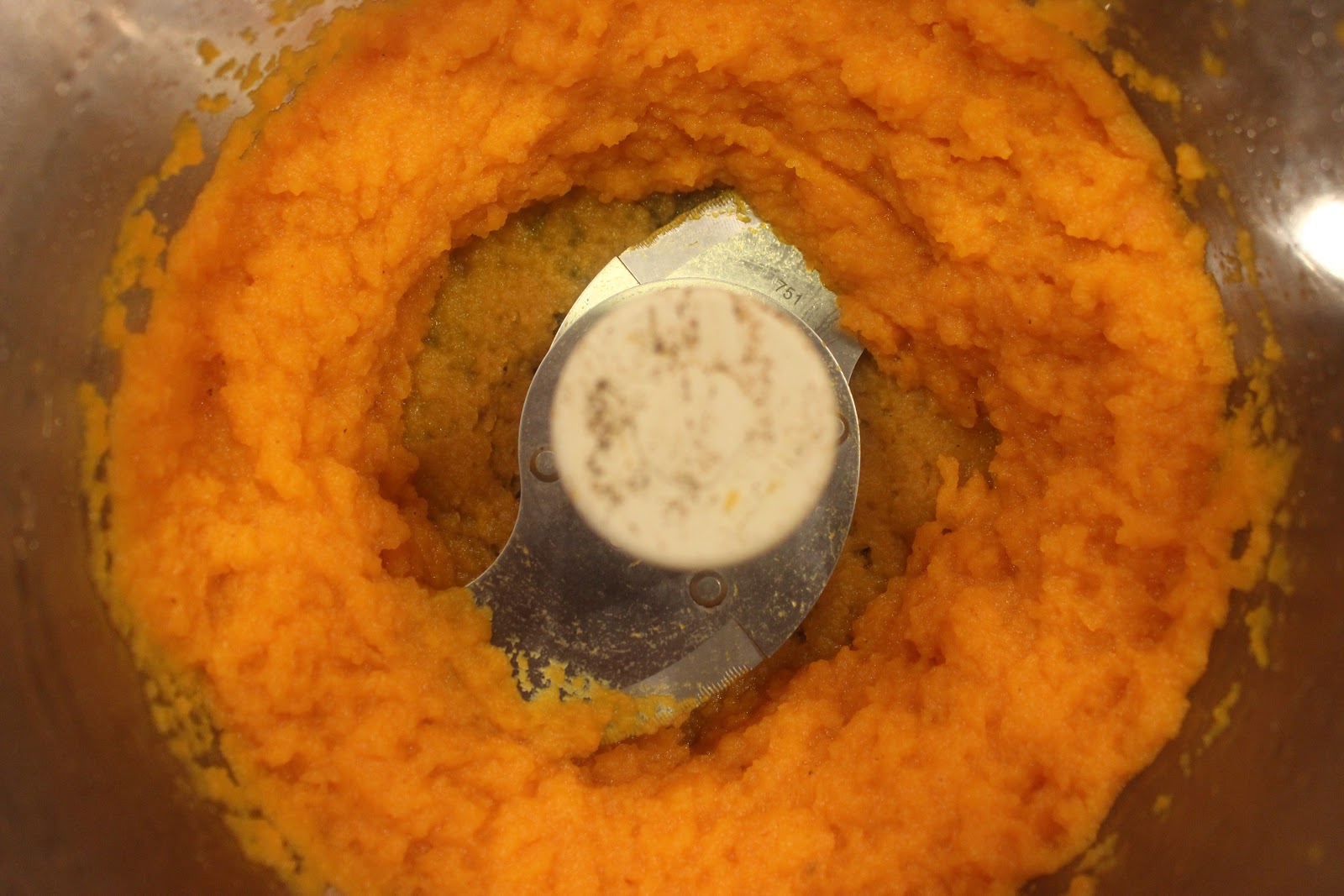 Set the carrots in a pan with high-sides and fill with water, until just covered, about one inch deep. Boil the carrots for 12 to 15 minutes until they are tender and can be pierced easily with a fork. Drain the carrots well and add them to the bowl of a food processor. Purée the carrots with one half tsp salt, one quarter tsp freshly ground black pepper and a pinch of nutmeg. Set aside.